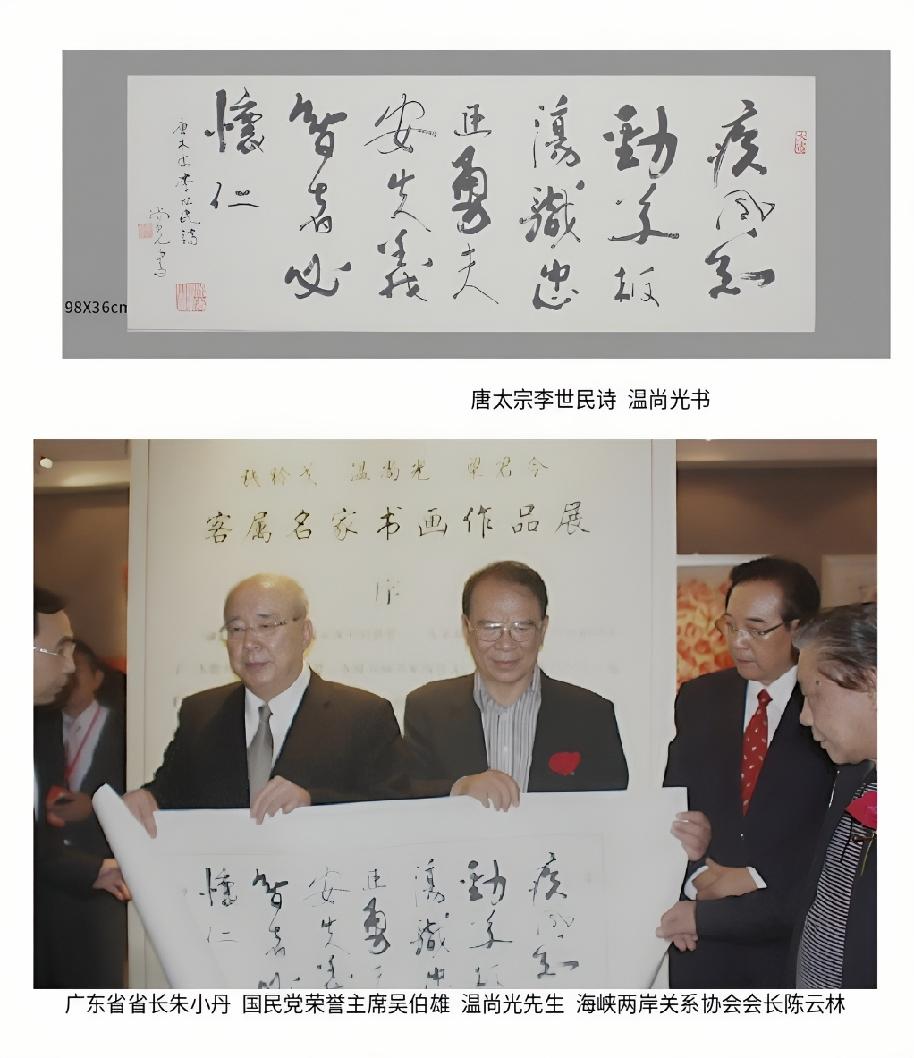 作为客属书 画名家代表,温尚光与梁君令联袂亮相“客属书画名家三⼈展”,在梅县⽂体中⼼的海内外嘉宾 ⾯前,尽展客家艺术的隽永⻛采。那⼀年,73岁的温尚光站在故乡的⼟地上,向中国国⺠党荣誉主席吴伯雄 赠送了⾃⼰的书法作品。时任⼴东省省⻓朱⼩丹在旁⻅证,三⼈合影留念,定格了两岸⽂化交流的珍贵瞬 间。在展览现场,当他看到熊启雄教授历时⼗年创作的339⽶⻓卷《中国客家村居图》时,这位游⼦情不⾃ 禁提笔写下“洋洋⼤观,笔精墨妙”的赞词。那是客家⼈之间的惺惺相惜,是艺术⾎脉跨越海峡的共鸣。作为⻩遵宪嫡系外孙,其⾎脉深处流淌着“⼨⼨河⼭⼨⼨⾦”的家国眷念,其毕⽣艺⾏,更堪称“正义、正直、正念”的笔底回响——不仅书写着个体的⻛⻣,更绘就了⼀个族群的魂灵与⼭河。